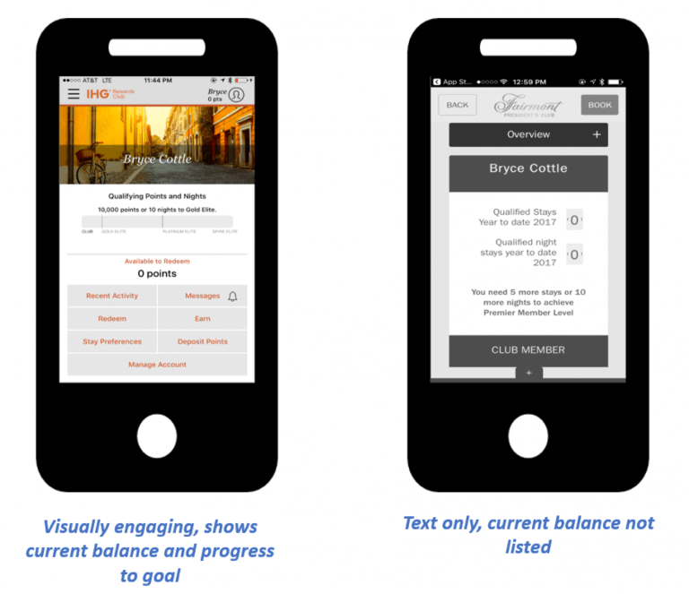 A recent JD & Associates study found that IHG Rewards and Fairmont President’s Club were at opposite ends of the spectrum in terms of customer satisfaction with their respective rewards programs.5 Looking at their mobile apps and how points progress is displayed on each may help explain why Hilton is a leader while Fairmont lags behind.
